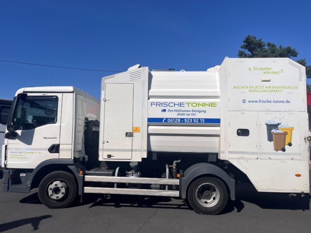 Die Firma „Frische Tonne GmbH“ verfügt über ein modernes Waschfahrzeug, welches die Behälter per Hochdruckspülung mit etwa 60 bis 65°C warmem Wasser reinigt. Ungeziefer, Bakterien, Sporen und Keime werden dabei auf der Innen- wie der Außenseite der Tonne entfernt und strenge Gerüche beseitigt. Diese Reinigungsmethode sorgt so für hygienisch saubere Behälter und ist zugleich ökologisch verträglich.