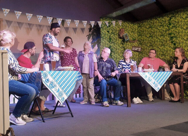 Das Ensemble der „Fidelen Brüder“ inmitten des chaotisch-lustigen Grillfestes: Unter schrägen Missverständnissen entfaltete sich auf der Bühne das turbulente Szenenbild der Komödie „Grillfest Hangover“, Die Szene zeigt: Alexandra Lasrich (Rosa), Matthias Böhm (Dieter), Eike Pilz (Werner), Lena Paul (Martina) , Christine Engelhardt (Christa), Jürgen Furrer (Harry), Bärbel Malisius (Nina), Michel Bucher (Karlheinz) und Katharina Wuttke (Hildegard). Foto: Klaus Schmitt