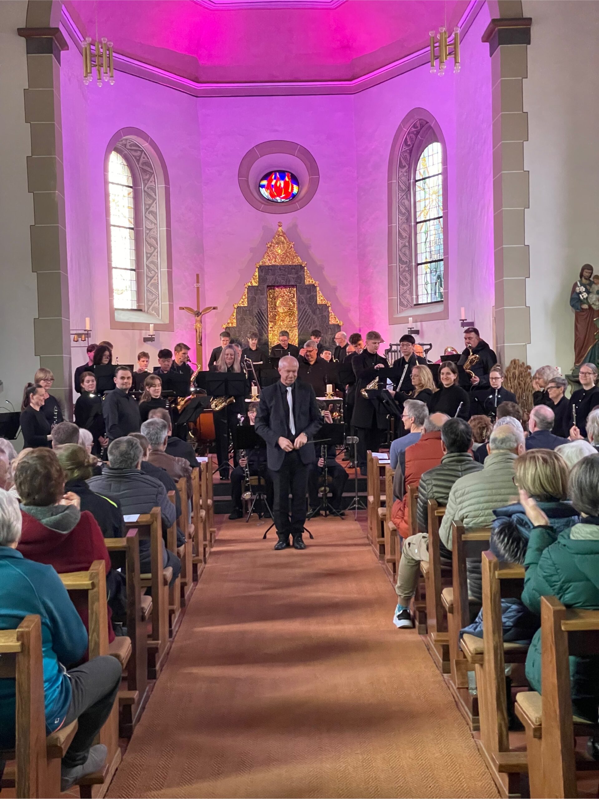 Der Musikverein knüpfte mit seinem Programm bewusst an die Geschichte der St. Andreas Kirche an und führte von barocken Meisterwerken bis hin zur modernen Musik. Unter der Leitung von Konrad Meier traten verschiedene Ensembles auf – vom großen Orchester über kleinere Bläserformationen bis hin zu kammermusikalischen Gruppen und nutzen die Akustik des Kirchenraumes optimal aus. Die Musiker positionierten sich verteilt in der Kirche, sodass die Klänge wie eine echte Zeitreise durch Epochen und Räume wirkten.