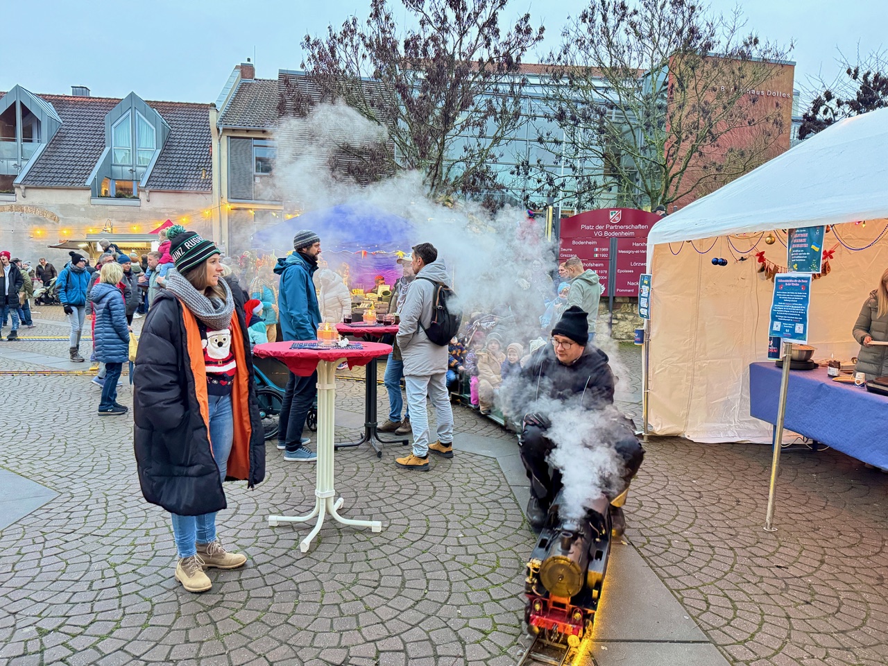 Für die Kleinsten gab es ein nostalgisches Kinderkarussell sowie die überaus beliebte Dampflok, die auf dem Innenhof des Dolles-Rathauses unermüdlich ihre Runden zog und die Besucher kräftig einnebelte. Die Großen erfreuten sich derweil an deftigen Speisen und warmen Getränken. Beliebt war zum Beispiel der Eintopf am Stand des Vereins „Nicht reden – machen“, der mit seiner Weihnachtsaktion Päckchen für Kinder in der Ukraine als Zeichen der Hoffnung sammelte. Natürlich gab es auch Bratwurst, Burger, das begehrte Stockbrot der ansässigen Bäckerei und vieles mehr. Die KulturBunten waren genauso vor Ort wie die Rettungshundestaffel, die Zuckerbäckerinnen der Abi-Klasse des Gymnasiums aus Nackenheim, der Chor der Grundschule oder die SPD mit Glühgetränken in allen denkbaren Variationen.