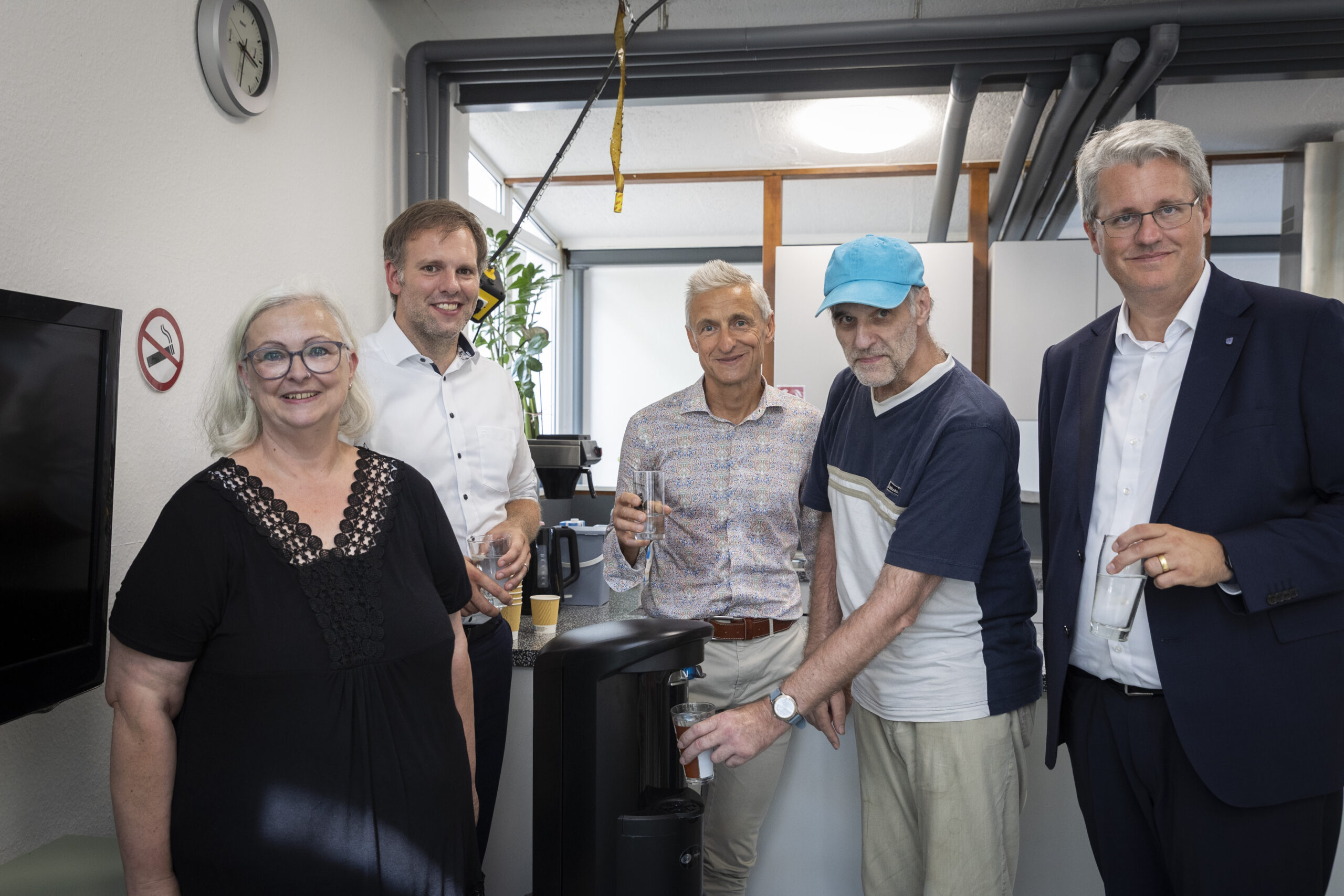 Ein Glas Wasser ist immer gut gegen Durst (von links): Kerstin König, Maik Landwehr, Lucian Lazar, Oliver Hof (Besucher der Wohnungsnotfallhilfe) und Oberbürgermeister Patrick Burghardt. Bild: Stadtwerke/Melanie Bauer.