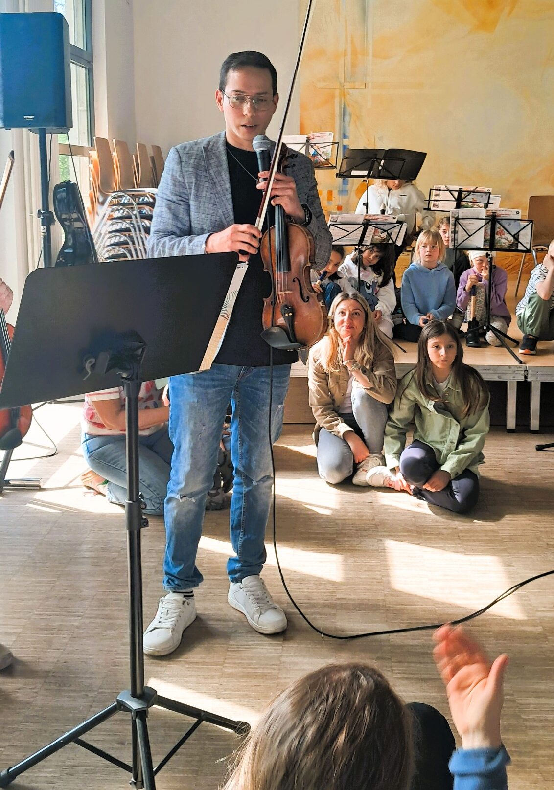 „Wir werden euch jetzt reihum verschiedene Instrumente aus der Gruppe der Streicher und der Bläser und auch das Schlagzeug vorstellen“, richtete er das Wort vor allem an die anwesenden Kinder, während ein Vater mit seiner Tochter gerade noch rechtzeitig den großen Saal betrat. „Hier kannst du mal gucken, was du vielleicht später mal spielen willst“, sagte er noch, dann ging es auch schon mit der Geige los, die Musiklehrer Luis Ortega gemeinsam mit seinem Schüler Maximilian vorstellte. Sie spielten ein kurzes Stück, erklärten den Bogen und die Saiten, die auch gezupft werden können, und erzählten, wo man als Geigenspieler überall dabei sein könne. Im Kammerorchester sowie im großen Orchester, als Begleitung zum Klavier oder in einem Streichensemble.